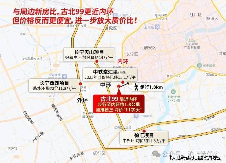 其次, 古北99步行到内环只有约1.3公里,均价“11”字头 ,而长宁天山项目贴着中环,预计14万/㎡;长宁西郊项目贴着外环,联动价11.8万/㎡。