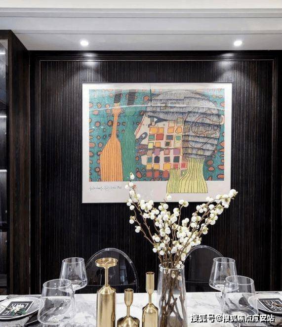 餐厅以棕色作为背景色,木质的材质,营造出摩登复古的气质。墙面上诙谐的挂画,彰显出空间艺术气息。