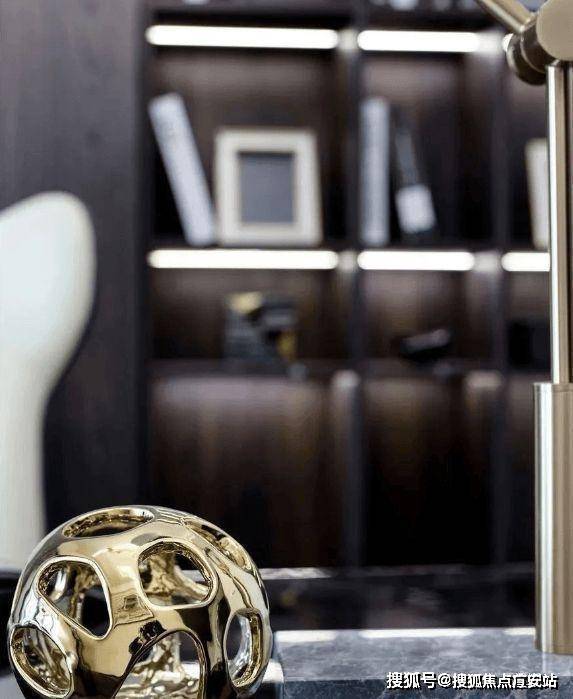 茶几上摆放着黄色金属的工艺品,通过材质的造型和线条,让空间显得更有设计感,同时也凸显出空间主人的精致和时尚。