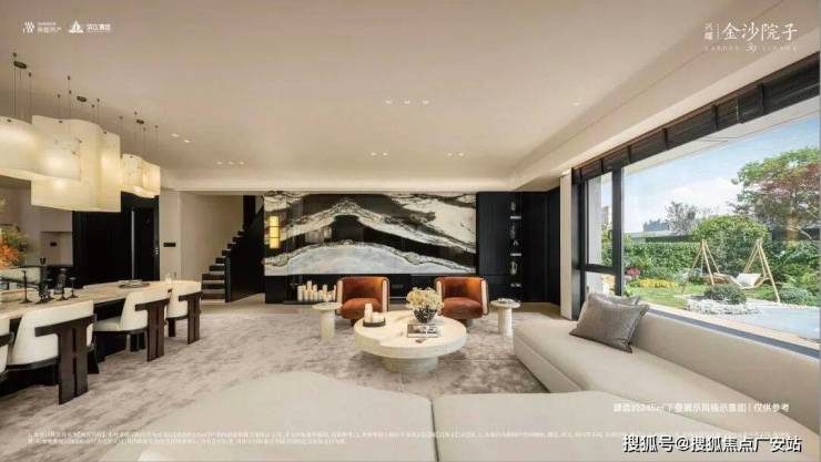 金沙院子的叠墅立面,有着艺术品般的质感。以美拉德暖色调为基调,搭配“艺术级流体无界屏”设计,凸显流线型“游艇立面”建筑美学。大面积铝板与玻璃的流动线条模糊了建筑与自然的边界,让建筑仿佛生长在大自然一般,诗意揉融,无限契合。