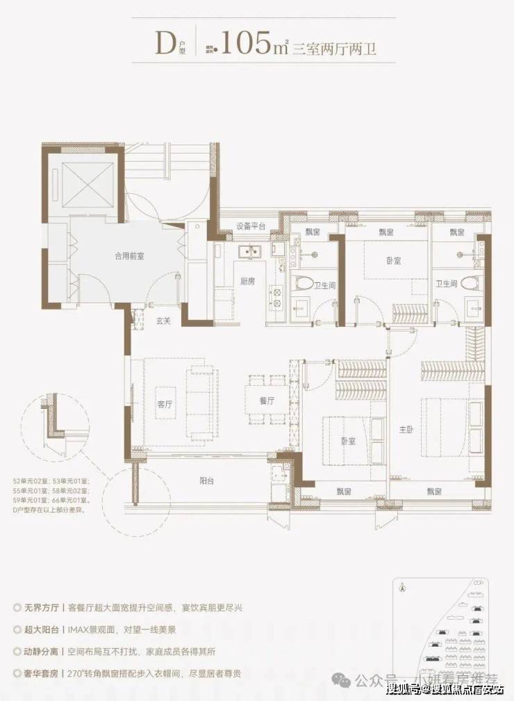 边套的餐厅、主卧和次卧,设置有多个270°全景飘窗,室内通透明亮。