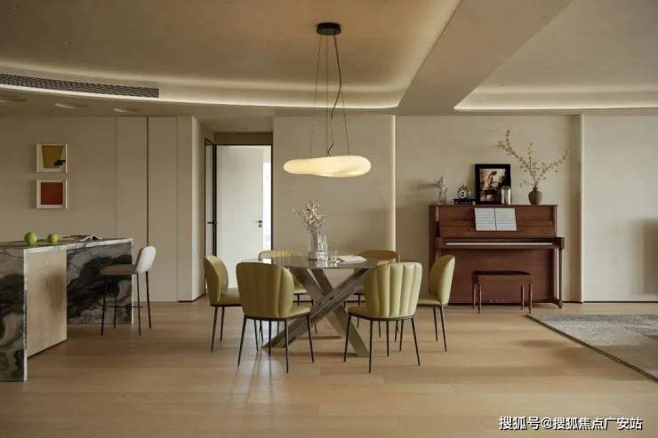 圆形餐桌的选择打破了直线的刻板感,水吧去方形的吧台,方圆的组合通过优化高度、融合材质与结构美学,将烹饪区升级,让整个环境充满温度。
