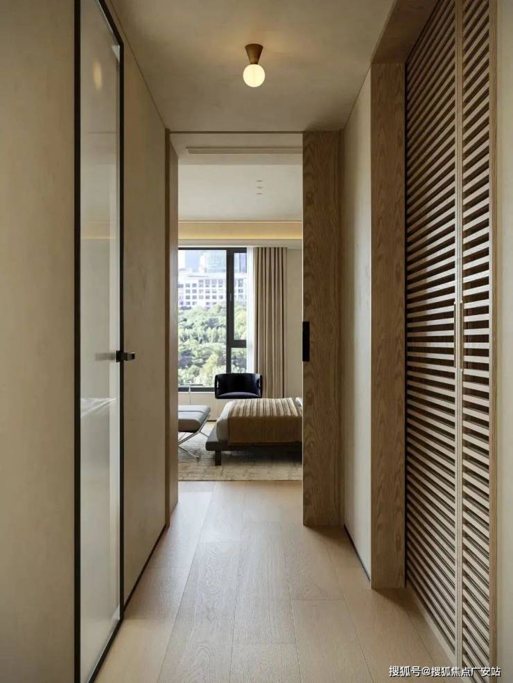 从玄关入户后,拆除了隔墙和移门,打开了整体的空间,横向贯通阳台、客厅、餐厅、水吧四个区域,在纵向上以饰面隐藏门取代实体隔墙,打造出了多功能房,让动线更加流畅,全方位打破了空间壁垒。