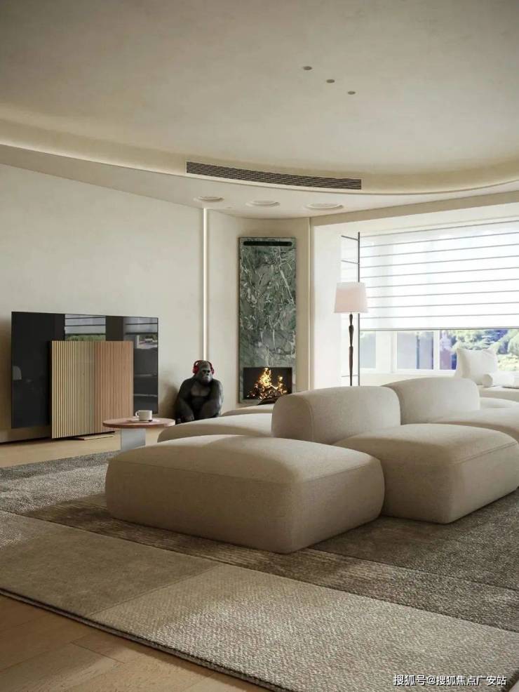 为营造自由通透的空间感,利用软装辅助流畅的生活动线,米灰色低饱和模块沙发,以多面体块拼接造型,灵动适配不同视角与布局,成为家庭的主要活动区域。