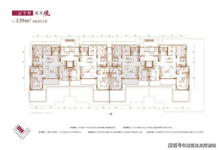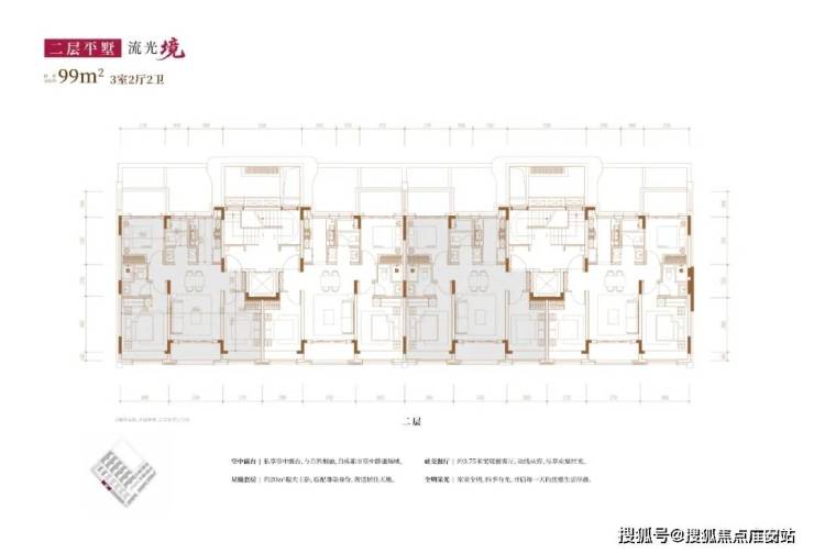 从内部空间体系来看,地上三层,层高分别是3.6米、3.3米和3.3米;每个单元一梯两户,每户均拥有类独立电梯厅;一楼带地下室及庭院,并通过创新退台式设计为二楼和三楼打造私家空中花园,形成户户有花园的墅居生活方式。