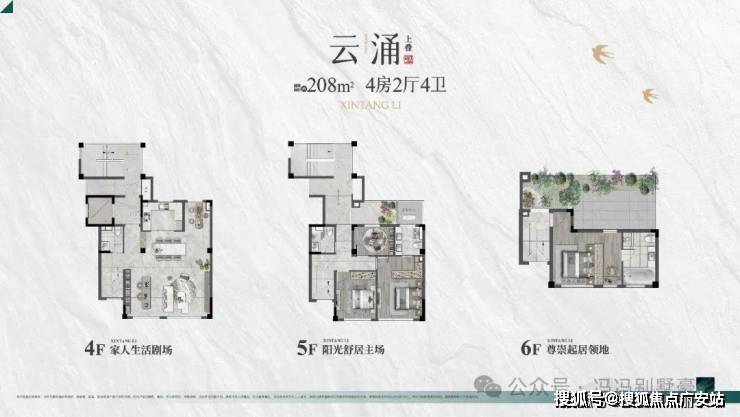 ·建筑面积约为208.45㎡4房2厅4卫的户型,上叠分为三层,地上四层、地上五层、地上六层(附带不上人屋面的大露台)。