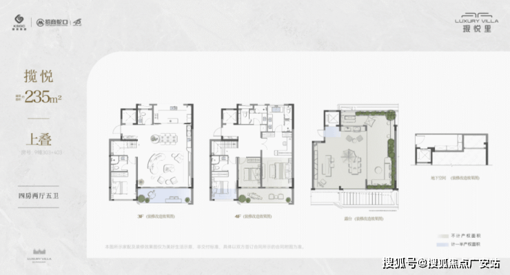 上叠235㎡(在售):四房两厅五卫,拓展后使用面积约360㎡,带约95㎡星空露台,独立电梯入户,私密性强 。