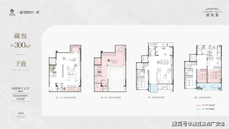 下叠300㎡(在售):四房两厅五卫,拓展后使用面积约430㎡,带约45–55㎡庭院 + 地下室可改造为影音室、健身房等多功能空间 。