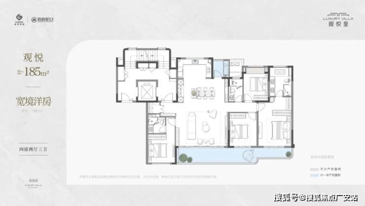 洋房185㎡(已售罄):四房两厅三卫,约13.4米南向巨幕阳台,LDKB一体化设计,主卧带270°寰幕视野阳台与独立衣帽间 。