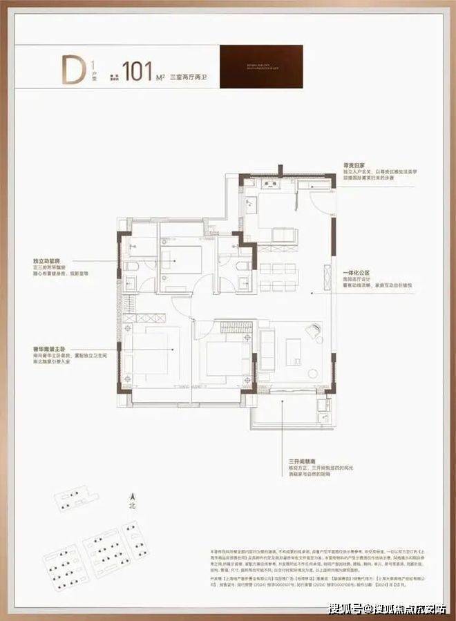 以主力建面约101㎡3房2卫户型为例,得房率高达约80-81%实际使用空间高达约80-82㎡,甚至超过了市面上部分洋房产品。