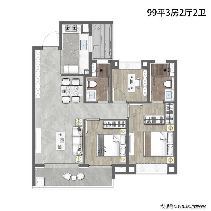建面约99㎡3室2厅2卫户型,做到了 三开间朝南+超大阳台+动静分离+主卧套房设计 ,延伸了室内实际可使用面积,采光、通透性都非常不错。