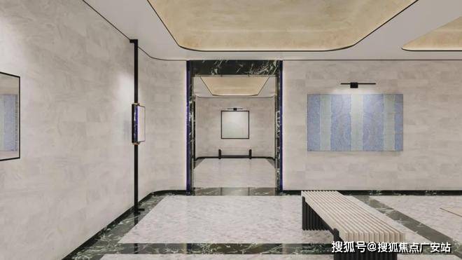 大堂前厅有别于大部分地库的设计,做了酒店式的体验。全石材的地面,顶上是一块艺术漆,周边陈列着青年艺术家的定制画作,打造艺术展览般的场景体验,业主们可以在这里放松心情,欣赏艺术,静下心来感受这处与外界不同的艺术空间。