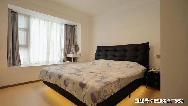 卧室通过黑、木、白三色构建出既沉稳又温润的休憩空间。黑色软包床(视觉重量100%)+原木地板(重量60%)+白墙(重量20%)营造悬浮感,此搭配使12㎡卧室获得15㎡的空间感知。