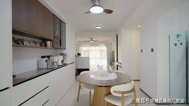 当夏季风扇低转速时,风扇灯将热浪切成薄片,光影在墙面投下动态复古电影胶片效果;靠墙定制整面收纳柜,其中开放格占比30%,用来展示业主淘来的好物件;而相比长方形餐桌的主客之分,圆桌消除等级感,还原家庭聚餐的平等氛围。