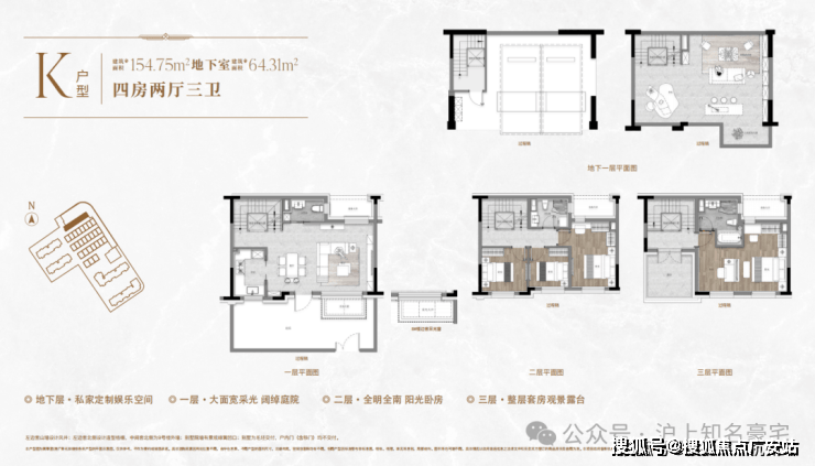 一楼和地下室主社交和志趣,二楼是子女的房间,三楼是主人休憩区。楼上楼下分层而居,各享私密,让子女私密主场与父母的静谧天地,互不干扰,即使业主举办小party玩到深夜,也不会打扰长辈们休息!