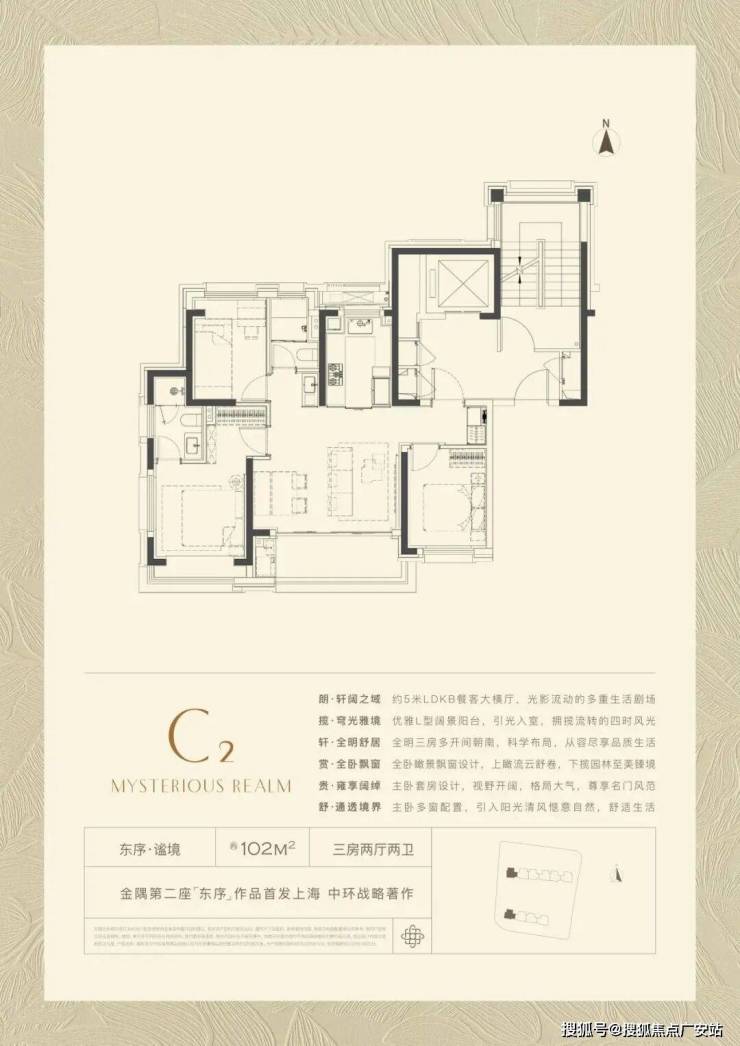 102㎡产品的全新产品,格局上超越了传统意义的三开间朝南,超大尺度的5米横厅,真正实现3.5开间,让业主起居之间沐浴更多阳光的同时,公区尺度感也直逼其他项目建面约100-120㎡户型。
