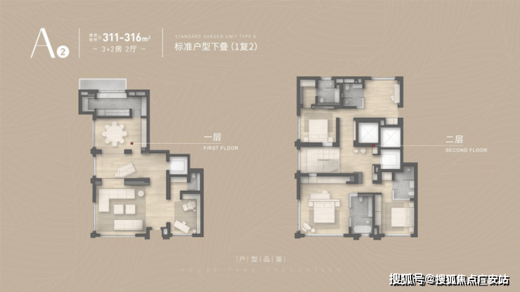 A2 户型(下叠):面积 311-316 平,单价 13 万,总价 4000-4100 万,房型 3+2 房 2 厅,附赠 1 楼花园 100-200 平。