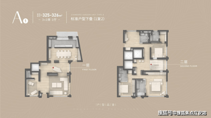 A1 户型(下叠):面积 325 平,单价 13 万,总价 4200 万,房型 3+2 房 2 厅,附赠 1 楼花园 100-200 平。