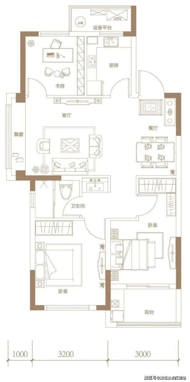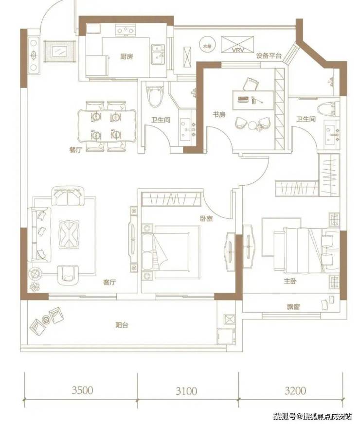 另一个主力三房户型,建面约103㎡,如果要为它的舒适度打分,几乎可以打满分。
