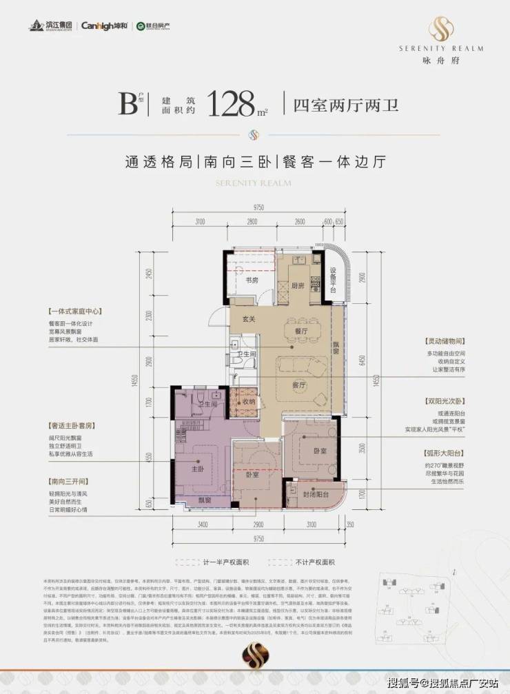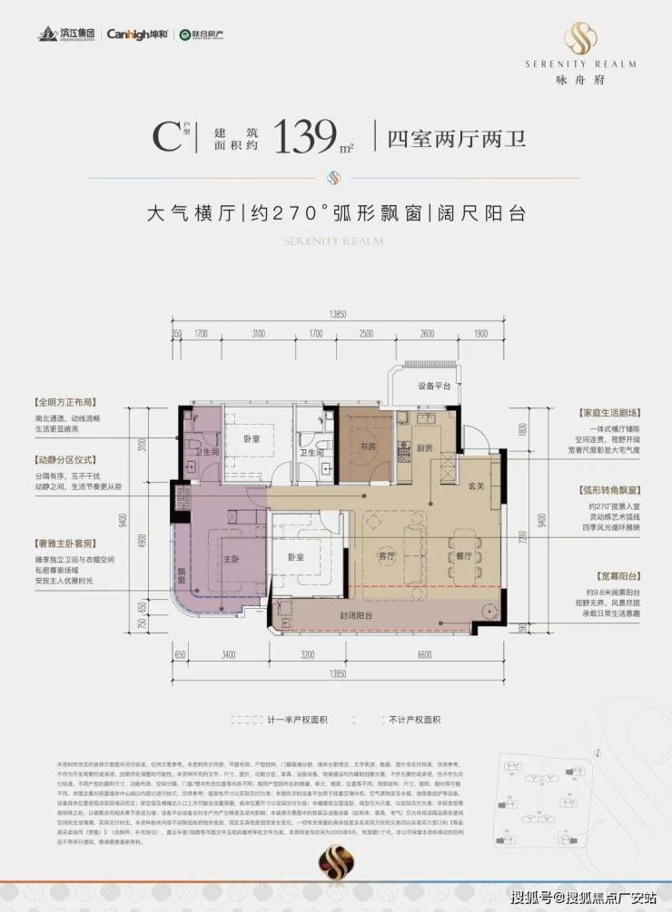 一款是四开间朝南的横厅户型,南向约13.85米的极致采光面,阳台也有约9.8米;动静分区,私密感超强;主卧套房带L型弧形转角飘窗,居住体感堪比全景舱。