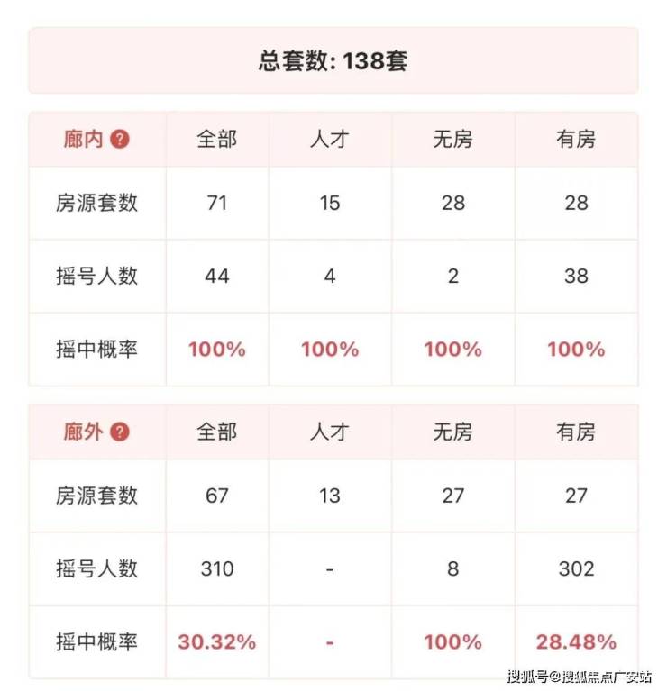 138套房源吸引了组家庭登记,其中人才4组,廊外有房家庭中签率最低,仅28.48%。