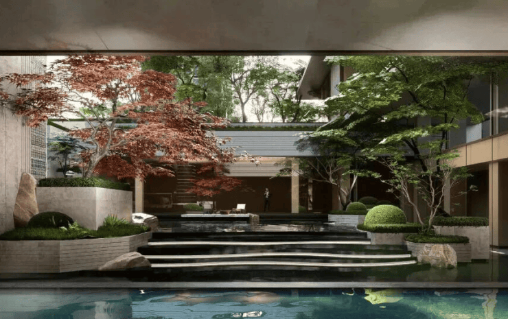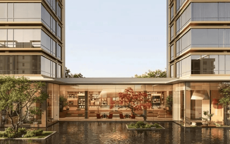 🟣超尺度界面,悬浮绿洲入口溯源曼谷嘉佩乐酒店和纽约安缦酒店灵感,打造“水上”迎宾通道,约100米超尺度城市界面,进深约36米的镜面大水景;借鉴新加坡Parkroyal on Pickering的垂直绿化形式,打造悬浮绿洲;以更立体的设计手法,构建城市浮岛的超级入口。