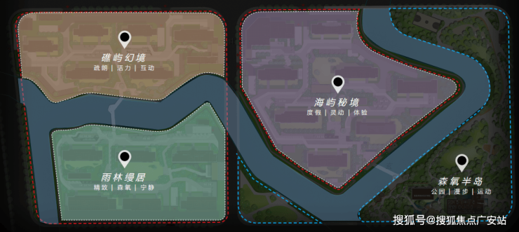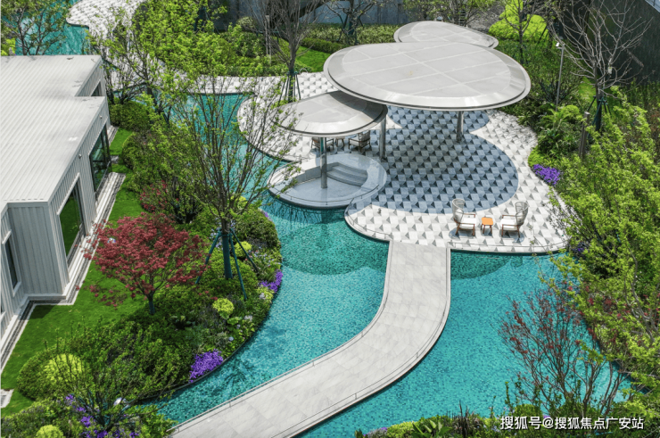 第一,项目由两条天然水系穿流而过,形成三座天然“岛屿社区”,开发商在三座“岛屿”设置不同主题,并铺陈丰富的景观节点。