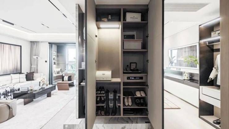 入户后,所有玄关柜均为交付标准,还精心配置了“除臭精灵”,下方更预留了扫地机器人的空间,为日常起居提供便利;像传统的豪宅三大件,项目采用大金品牌中央空调地暖两联供,以及格兰斯柯的新风。