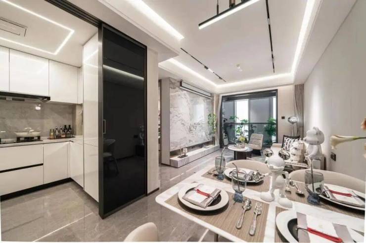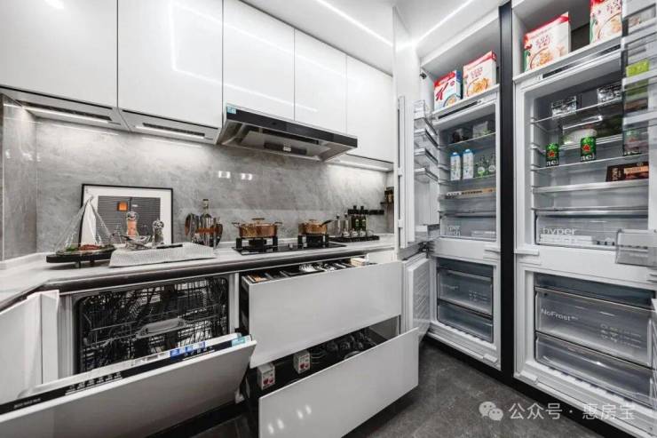 在户型的生活动线设计方面,象屿也极尽巧思,如在厨房采用U型设计动线,让住户一个转身就完成洗、切、配、烧四个步骤,省时省力;同时配备西门子品牌脱排、灶具、洗碗机三件套,以及嵌入式冰箱,方便了居家生活……