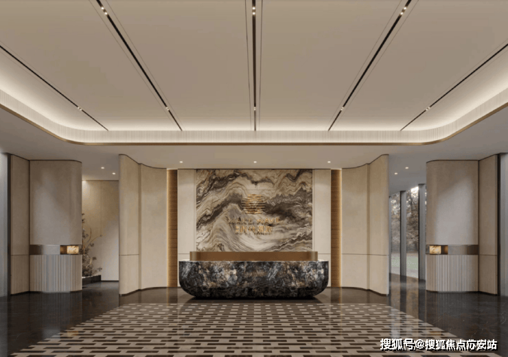同时,入户大堂立面造型延续了主立面的框与线结合,飘顶弧形雨棚,组成高定入户大堂,增加入户仪式感。