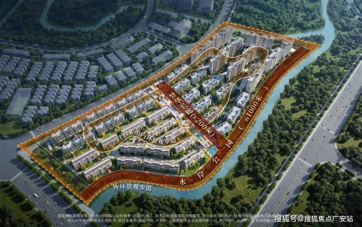 你看下面这张建发海宸的俯瞰图,整个地块三面都被绿地与河道包裹,尤其是项目东侧,公共绿地、滨河景观带、城市生态走廊此地排列,天然具备构建多层次景观视域的条件。