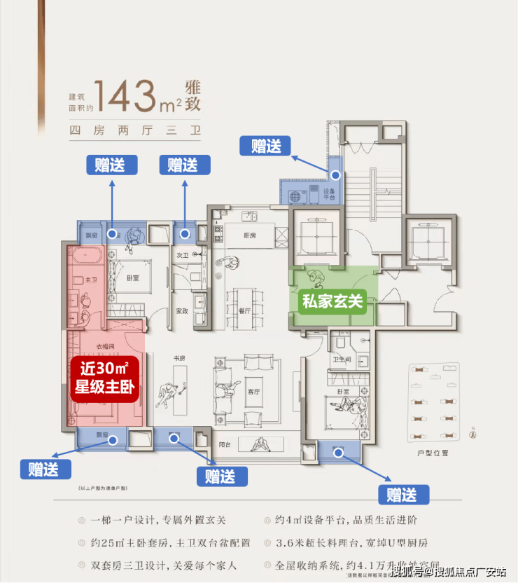 143㎡飘窗赠送面积为7.83㎡,主卧面积24㎡+飘窗2.88㎡,整个主卧面积可达26.88㎡;