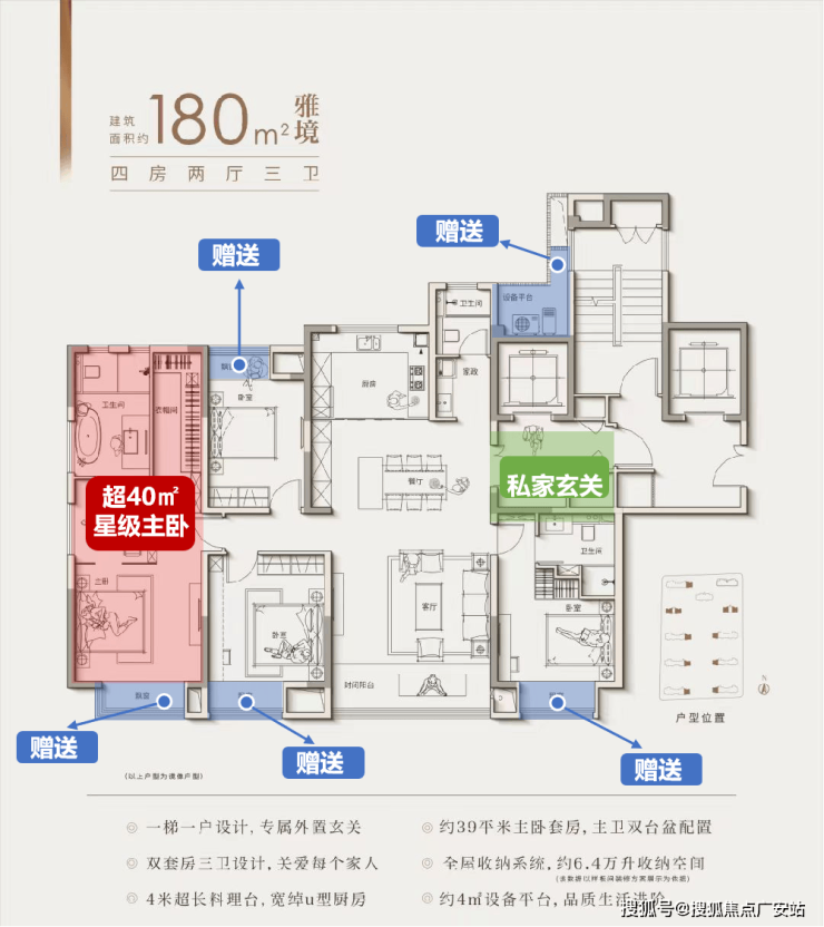 180㎡飘窗赠送面积为7.56㎡,主卧面积38.9㎡+飘窗2.16㎡,整个主卧面积高达41.06㎡;