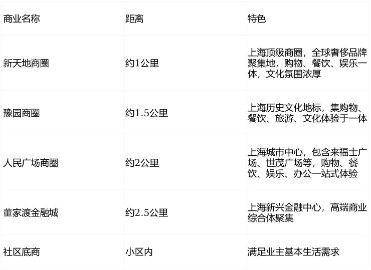 🛍️顶级商业配套环伺:3公里范围内覆盖新天地商圈、豫园商圈、人民广场商圈、董家渡金融城等顶级商业综合体,满足高端购物、餐饮、娱乐需求