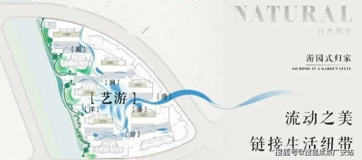 社区规划:铝板+LOW-E玻璃流体立面,繁星式楼栋布局;约450米天然水系环抱,酒店式归家大堂、架空泛会所(共享办公、儿童乐园)、智慧社区系统