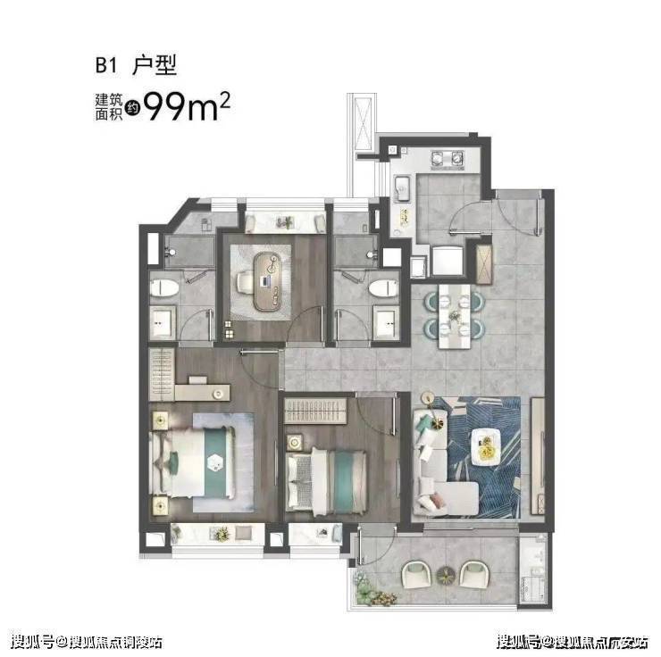 建面约99㎡3房户型图▼