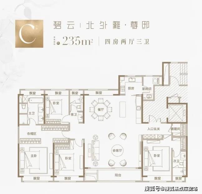 建面约235㎡四房 餐客厅面积达到近60㎡