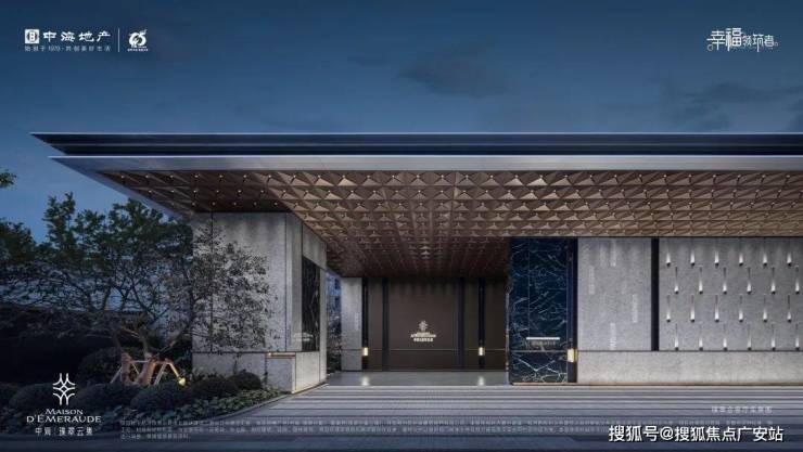 如果你来参观,首先映入眼帘的是约37米延展面的府院式大门,大面的prada绿奢石处理,主墙面浅灰色石材搭配深灰色金属条勾勒,各类石材组合,上方悬挂约4米高星空雨棚,光与影的跃动之下,尊贵的归家体验。
