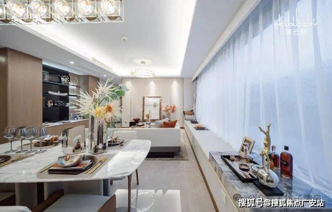 餐客厅一体,客厅与南次卧共享两面采光的双开大阳台,不仅公共区域空间更大气,而且日常晾晒很方便,景观视野更是广阔。