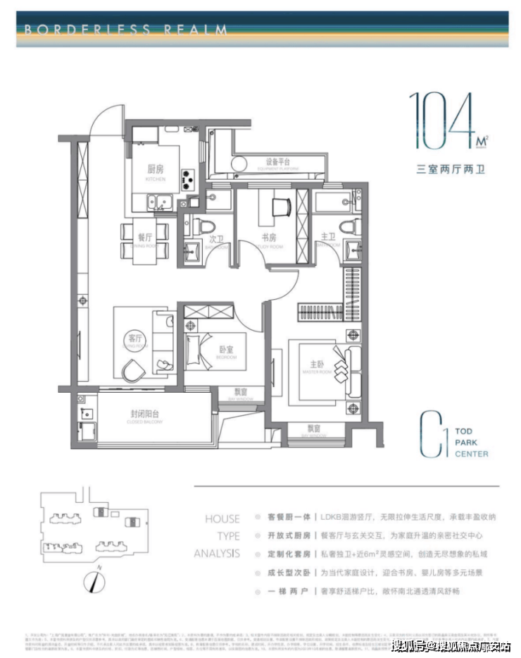 建面约104m²户型特点: LDKB洄游式竖厅+开放式厨房,生活尺度无限拉伸,主卧近6m²灵感空间,承载更多功能可能,成长型的次卧,书房儿童房随心所欲。