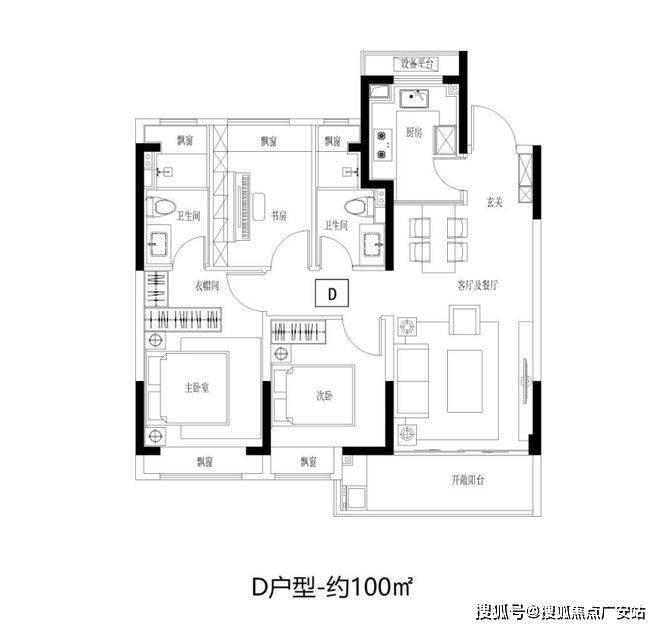建面约100㎡3房2卫,阳光三房,同等面积更多功能;宽幅南向观景阳台,把居住变成风景;步入式衣帽间,给予生活更多从容。