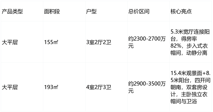 155㎡3房5.3米宽厅+阳台,193㎡4房四开间朝南+双套房,空间尺度与私密性兼顾。