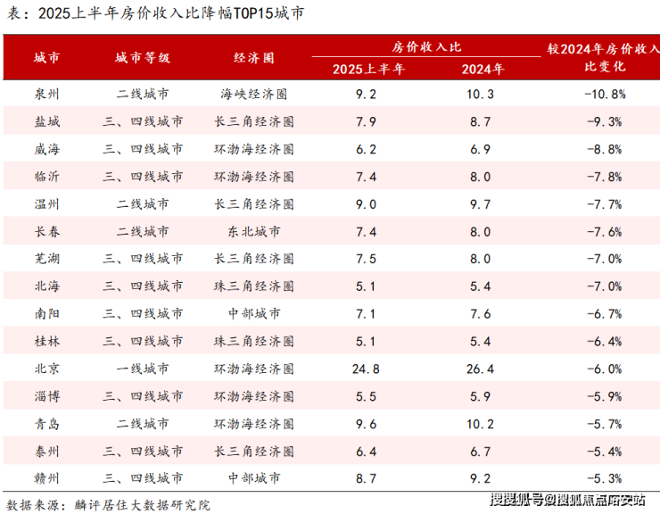 根据报告,上半年百城房价收入比上升的城市近有10个,其余90城房价收入比均不及2024年。其中,房价收入比上涨城市中长三角经济圈覆盖较多,如宁波、金华、淮安、常州房价收入比微升。相反,房价收入比下降的城市则以三四线城市为主,泉州、盐城、威海房价收入比降幅居前三,分别下降10.8%、9.3%和8.8%,均得益于城市内房价呈现明显的下降局面。