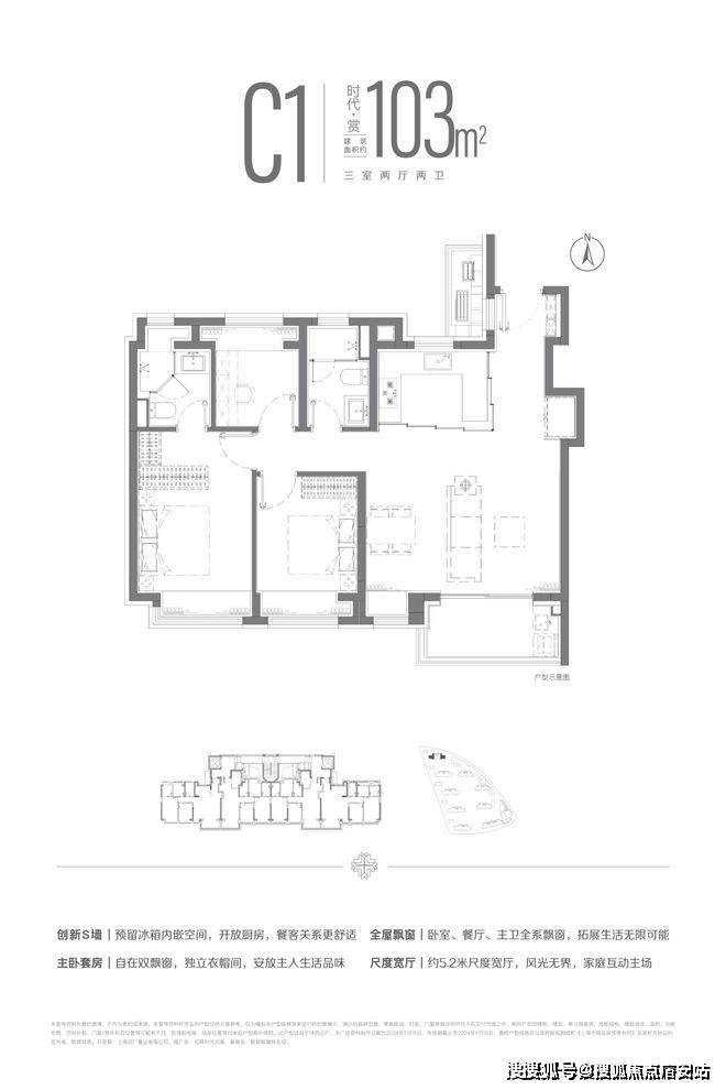 建面约103m²三房两厅两卫户型,南北双卧L型270°揽境飘窗设计,更大限度地让自然融入与自在之中,更宽阔的空间尺度,让自在生长与自然之中。