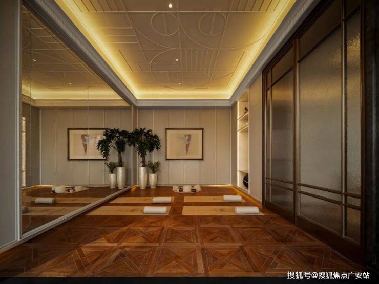 轻法式风格高定瑜伽室,镜面雕刻暗藏巧思,以现代化手法演绎ARTDECO图形元素,延续健身空间美学。
