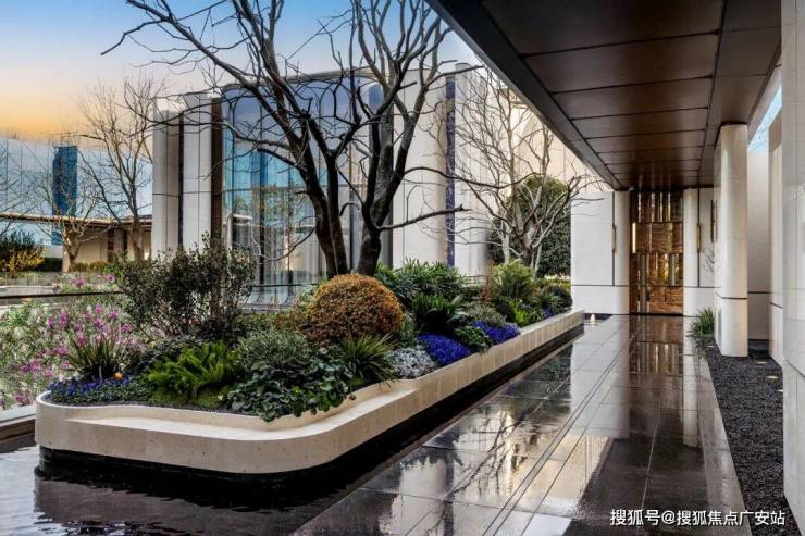 门庭外,两侧辅以具有仪式感的跳泉水景,将建筑的圆弧美感与自然水景相合,共同构成海上·清和玺“贵雅清和”的城市界面。