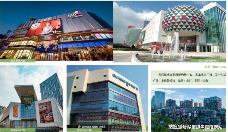 生活半径范围内商业醇熟完善,拥有 龙湖天街、百联、苏宁、传悦坊、宝龙广场 等大型商业综合体,西侧 约25万方超大商业综合体——金鱼广场 也在有条不紊地建设中。