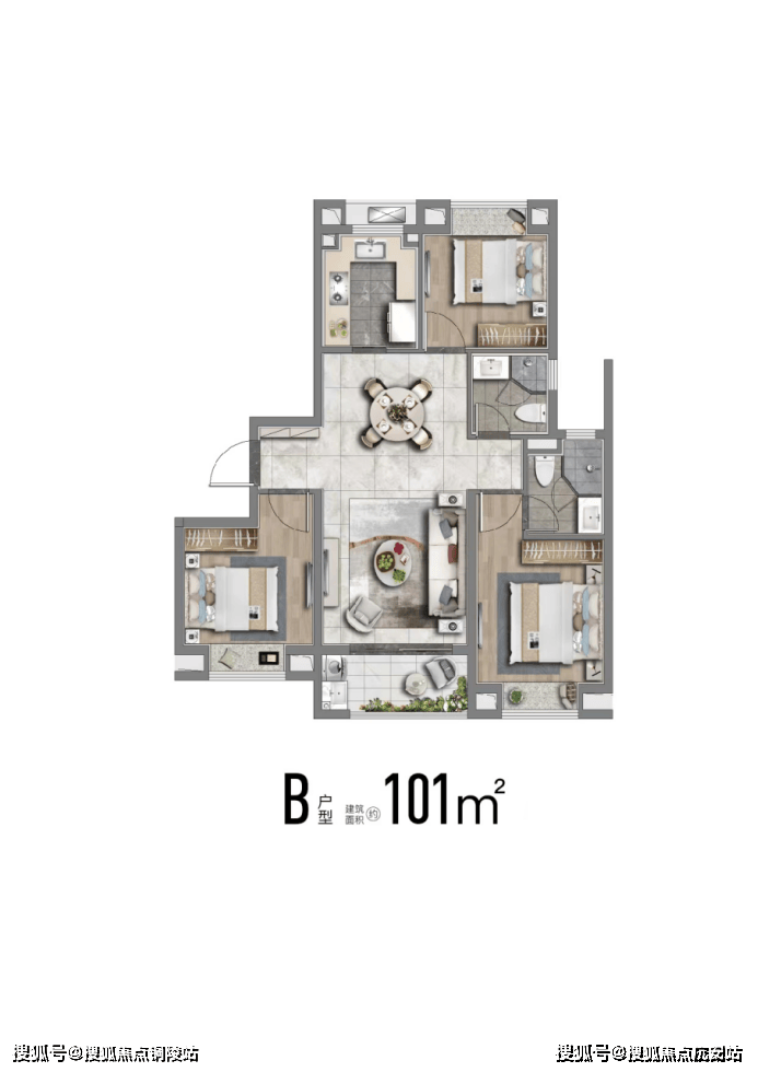 也有建面约113m²舒适性三房,南北通透;飞机户型,房间分列两侧互不打扰;卧室空间也相对更大、更舒适。