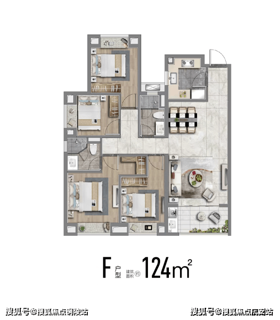 建面约124m²四房,市面常见的四房普遍要135平,这个约124平米户型功能性拉满,且控制了总价,给予更多小伙伴一步到位的机会。