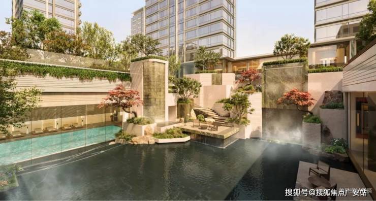 从设计图上看,这个小区地面布置了大量的景观水系。南面主入口的小区门厅外,就做了大面积的对称水景,穿过大门后,又是下沉庭院和景观水系,整体连贯铺陈,仿佛湖中小岛。